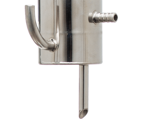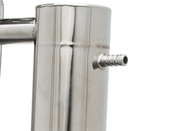 Спиртовой пар, без примесей и сивухи, попадает в вертикальный холодильник (7). ВАЖНО: подключайте холодильник правильно: xолодная вода должна заходить в нижний штуцер — так вы добьётесь максимального КПД охлаждения. С аппаратом Германия вы получите абсолютно чистый и холодный напиток на выходе, причём без потерь и лишних усилий.